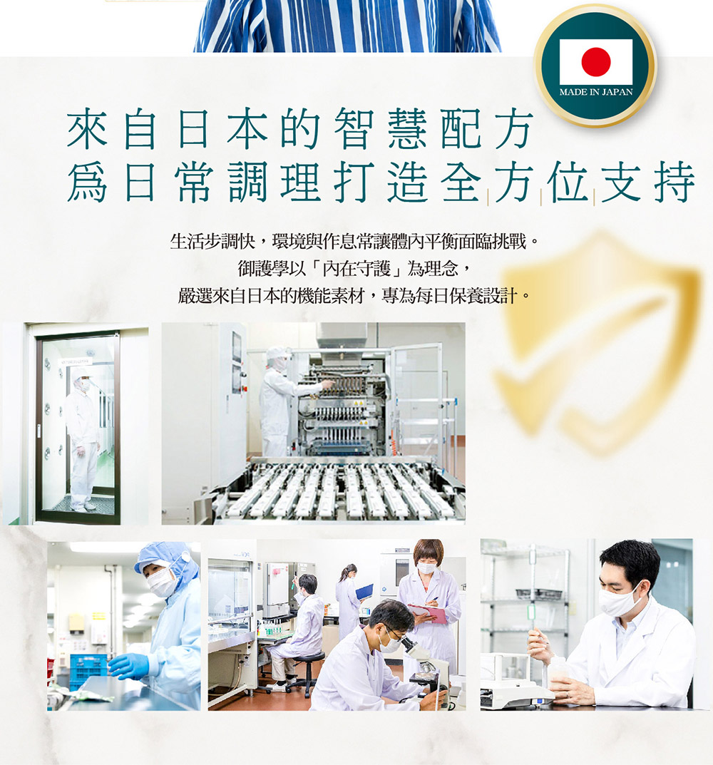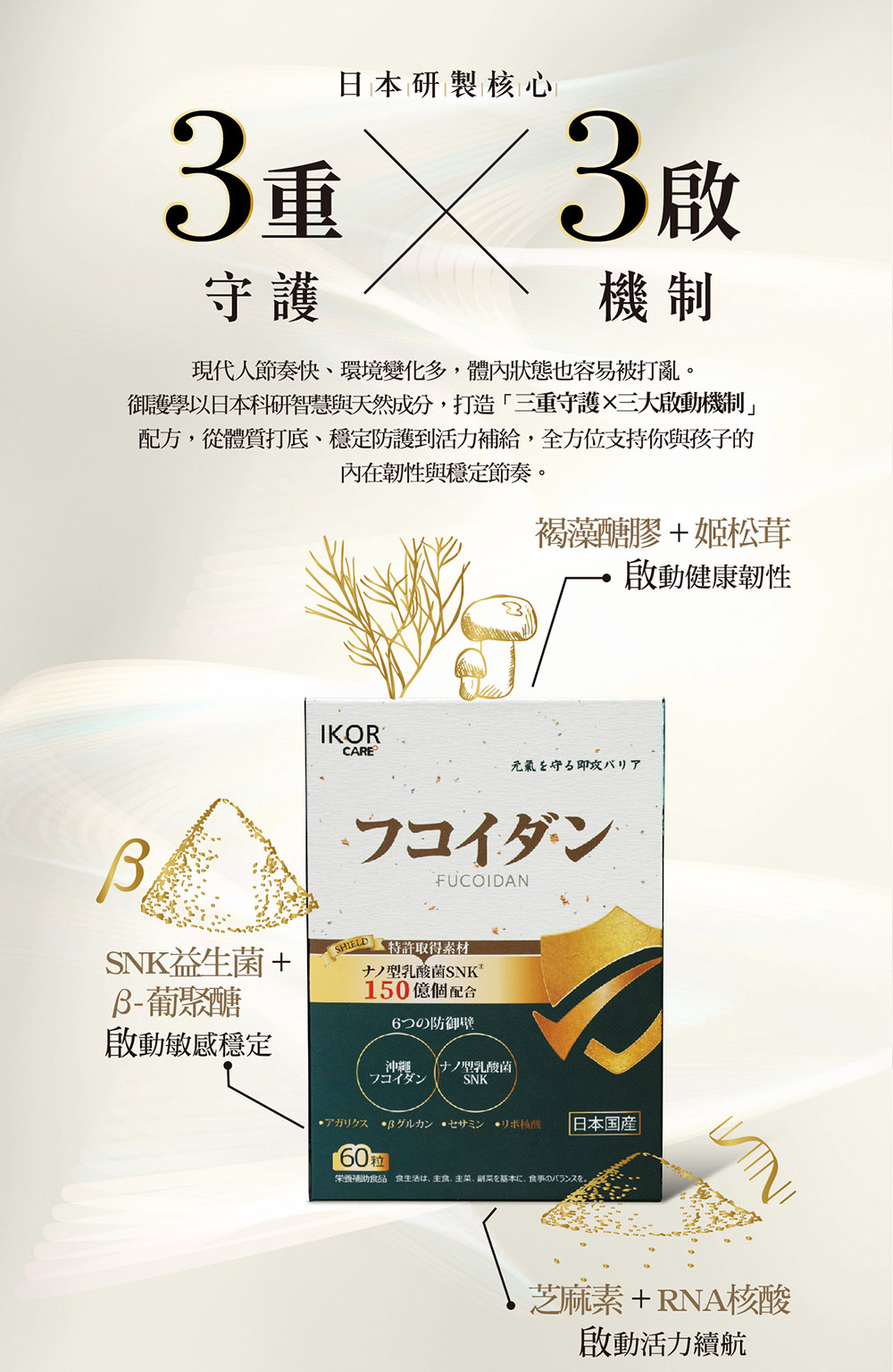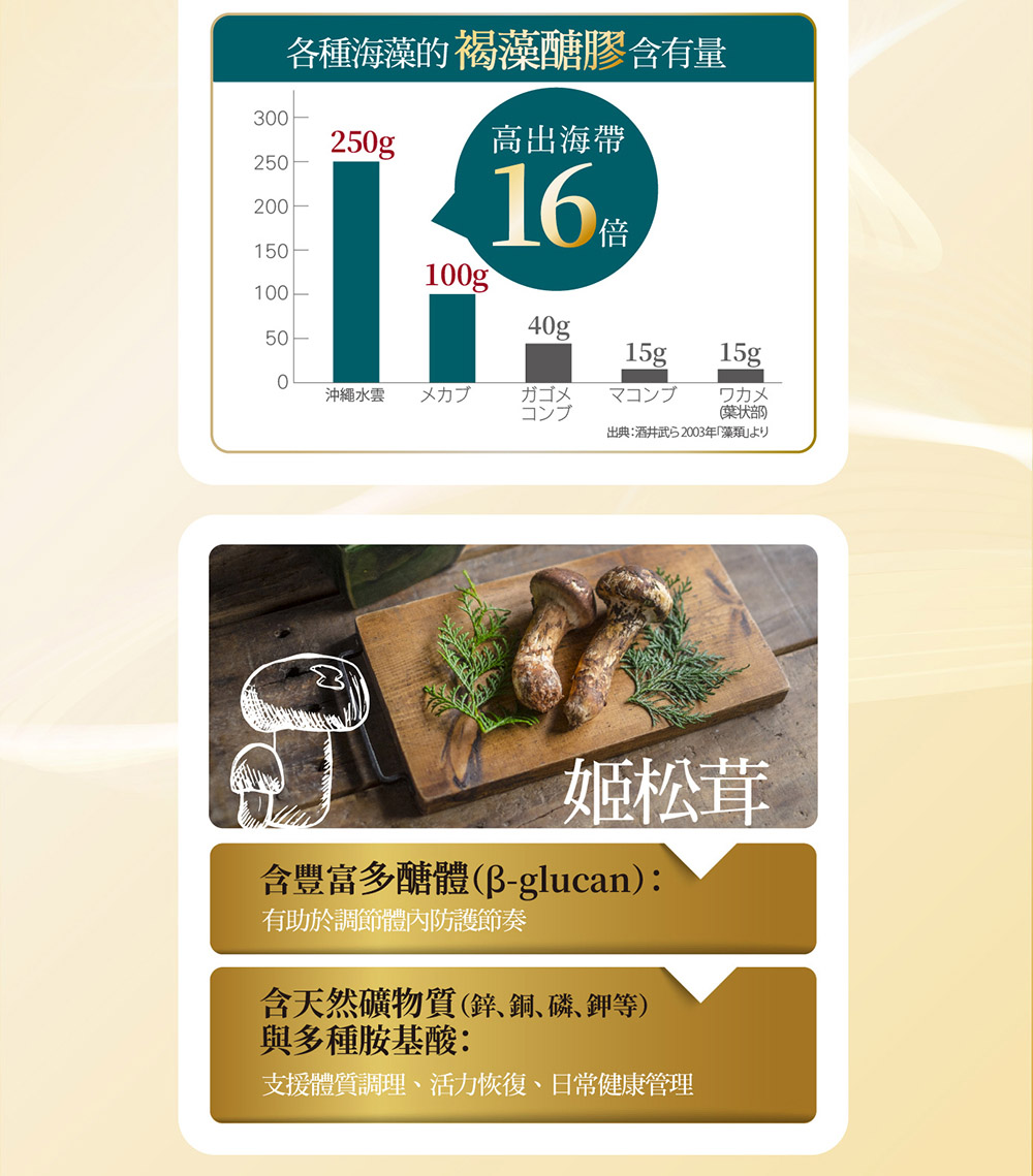 - 沖繩水雲萃取物、姬松茸、β葡聚醣、RNA核酸、SNK益生菌、芝麻素