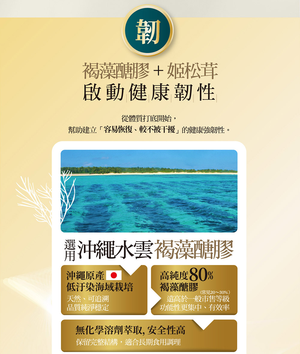 主成份沖繩水雲萃取物、姬松茸、β葡聚醣、RNA核酸、SNK益生菌、芝麻素