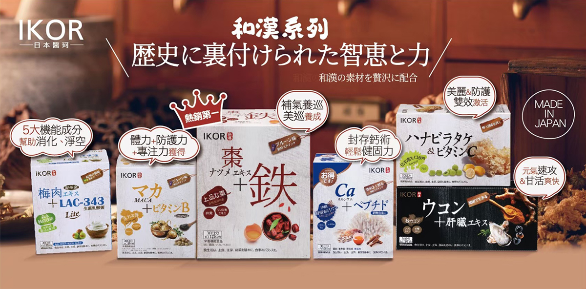 在日本藥妝人氣品牌ITOH滿足基礎保健需求之外,後續更引進IKOR一系列高機能性保健品,以更完整的成份、高劑量、高實感滿足不同的健康需求。