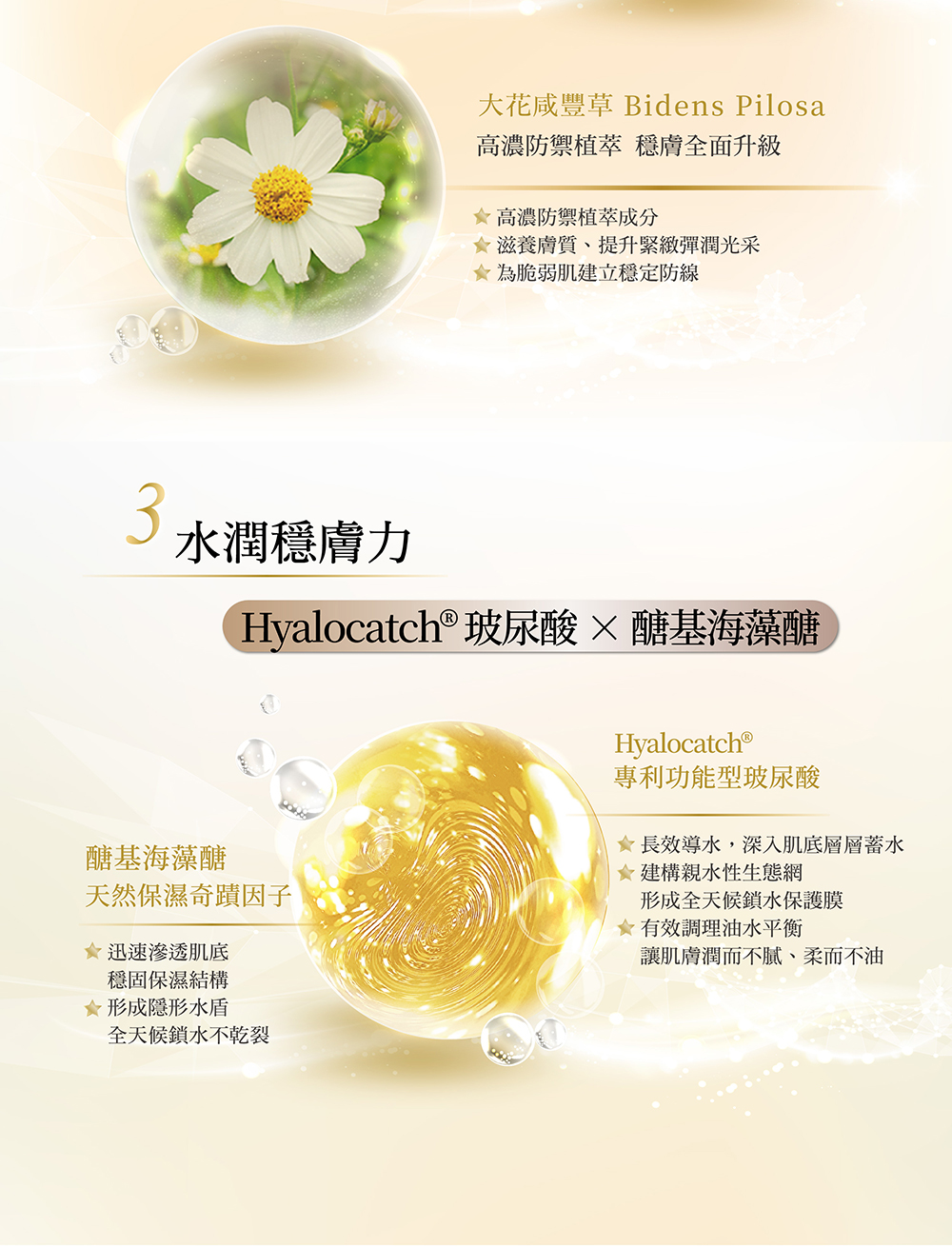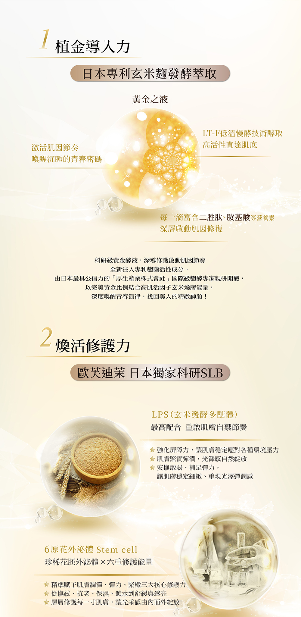 獨家科研SLB成份(6原花外泌體、LPS玄米發酵多醣體、大花咸豐草), 日本玄米麴精華ASPER Extraxt Gold®、糖基海藻糖、專利玻尿酸