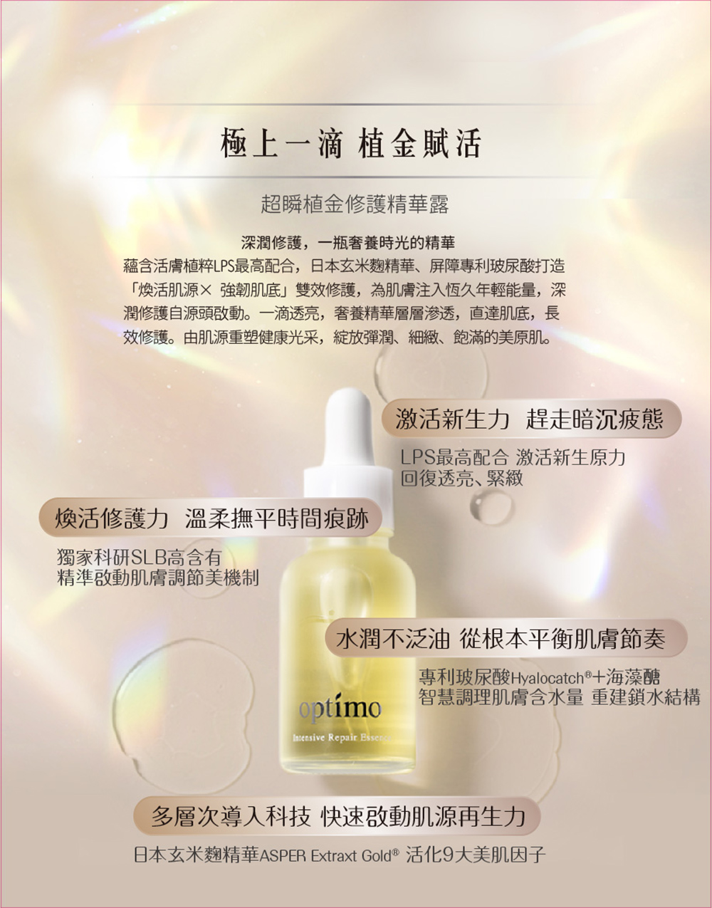 蘊含活膚植粹LPS最高配合,日本玄米麴精華、屏障專利玻尿酸打造「煥活肌源✕強韌肌底」雙效修護,為肌膚注入恆久年輕能量,深潤修護自源頭啟動。一滴透亮,奢養精華層層滲透,直達肌底,長效修護。由肌源重塑健康光采,綻放彈潤、細緻、飽滿的美原肌。